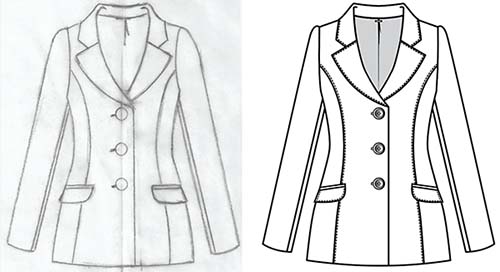 Instead of a long talk about Adobe Illustrator let me show you one example, that illustrates advantages of Adobe Illustrator application in the Fashion industry. Have a look at the jackets below – one is hand drawn and another is created in Adobe Illustrator. Lines created in Adobe Illustrator are easy to edit. Illustration can be copied, scaled, filled with various colors and so on.