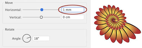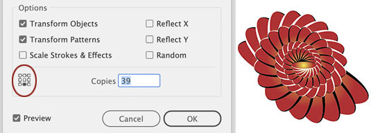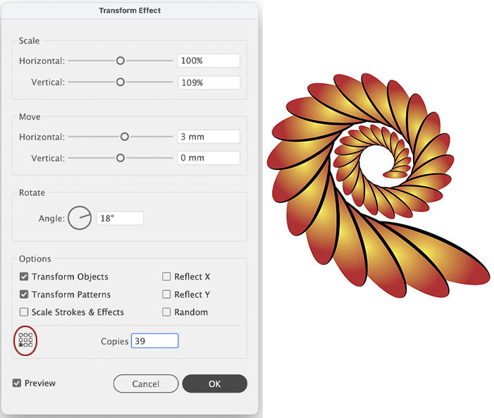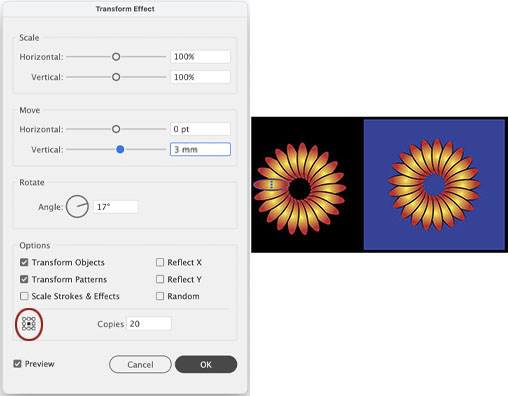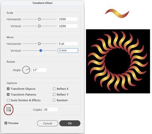 6. Experiment with the Horizontal and Vertical Scale, Rotate Angle, Reference Point, number of copies in the Transform Effect dialog box.