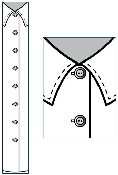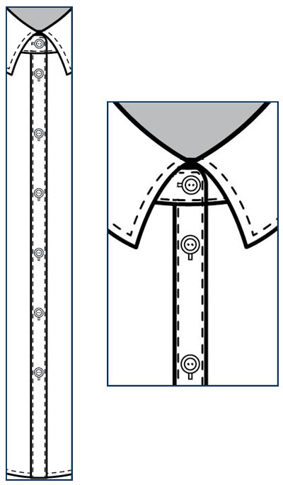 2. If you draw a blouse with a collar stand and a placket, depict one buttonhole horizontally on the collar stand. Buttonholes on the placket should be depicted vertically below buttons. Vertical buttonholes should be strictly on the placket middle line.