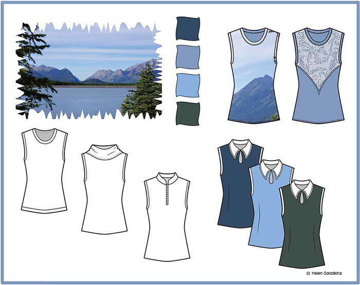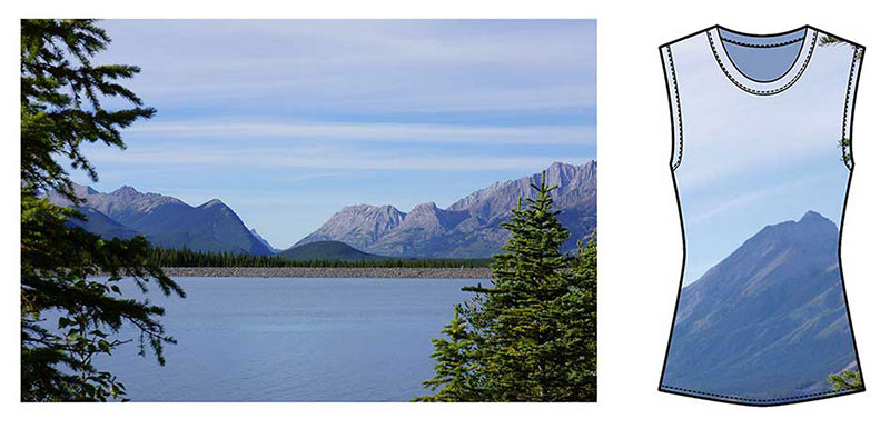 I created a textile print (placement print) for this top by using my photo of a beautiful Canadian lake and mountains.